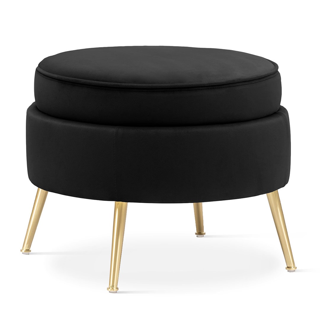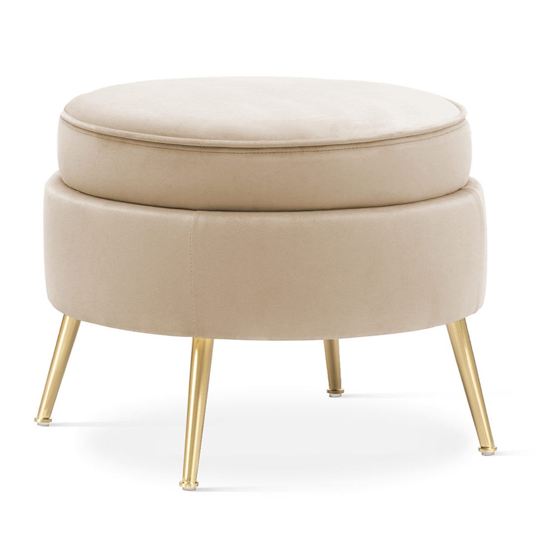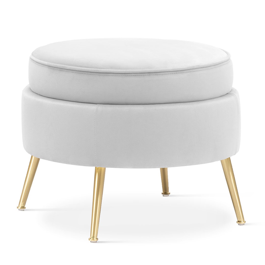 Tapicerowany okrągły podnóżek na nóżkach w kolorze złotym lub srebrnym. Podnóżek dedykowany fotelowi Muszelka.