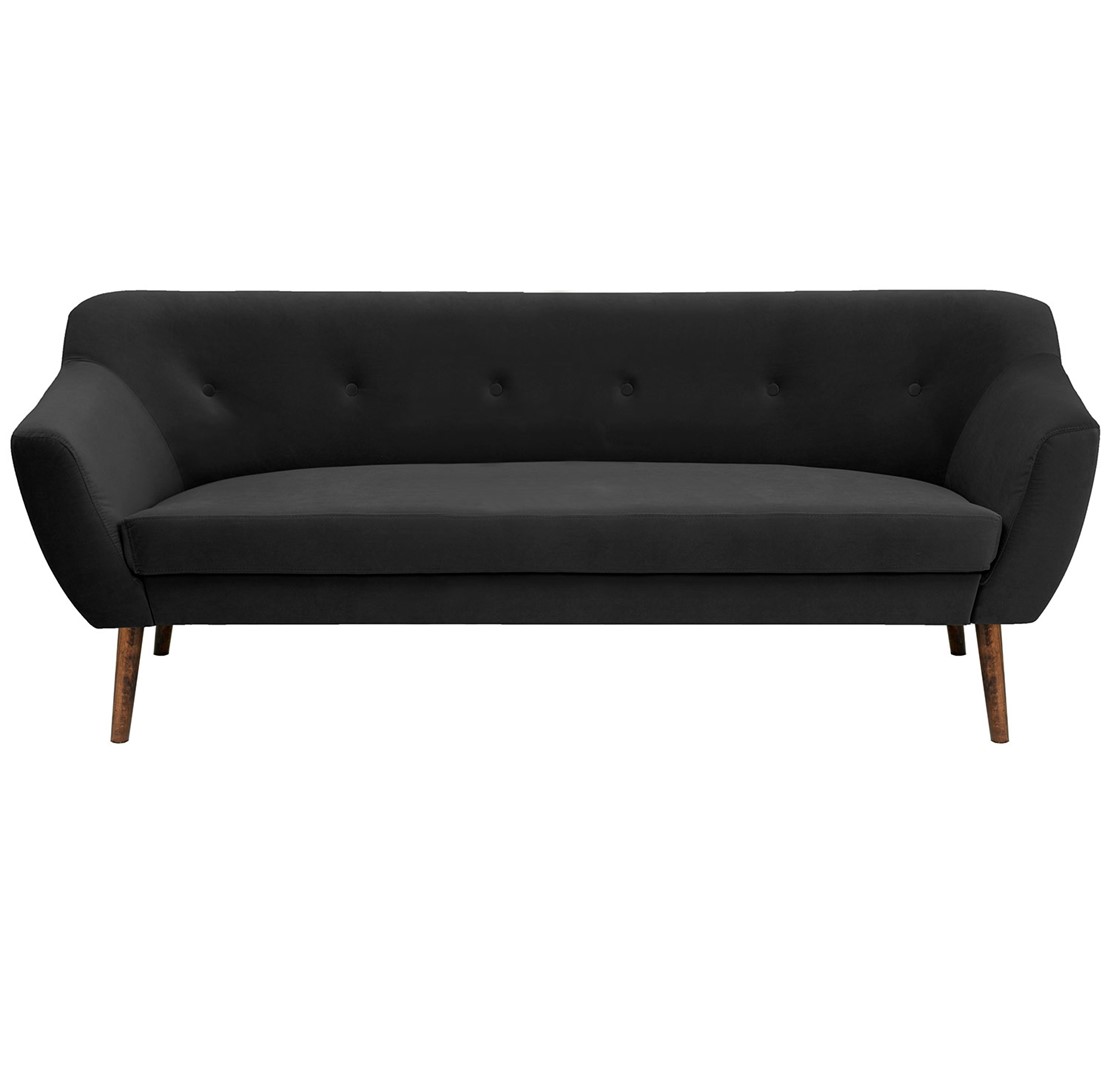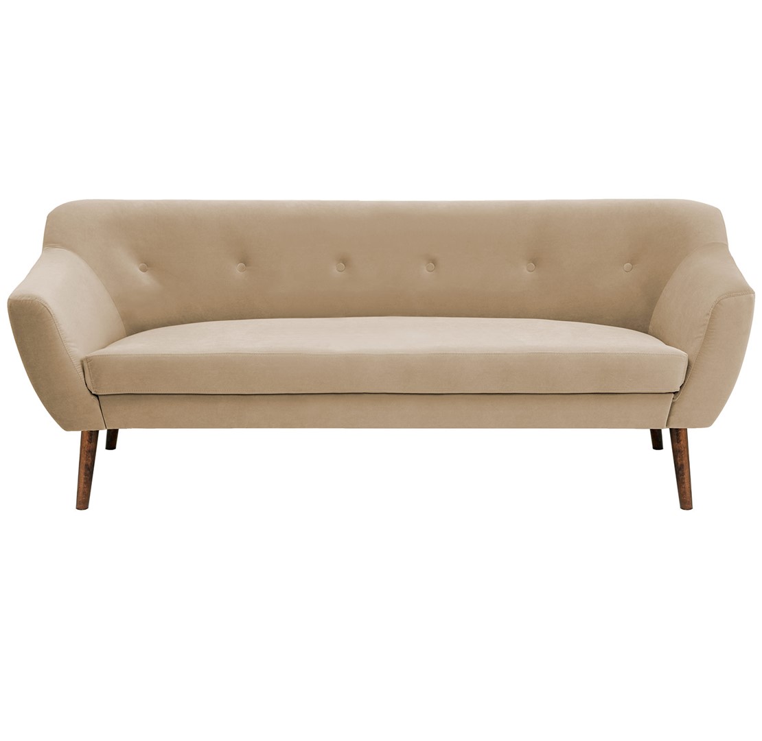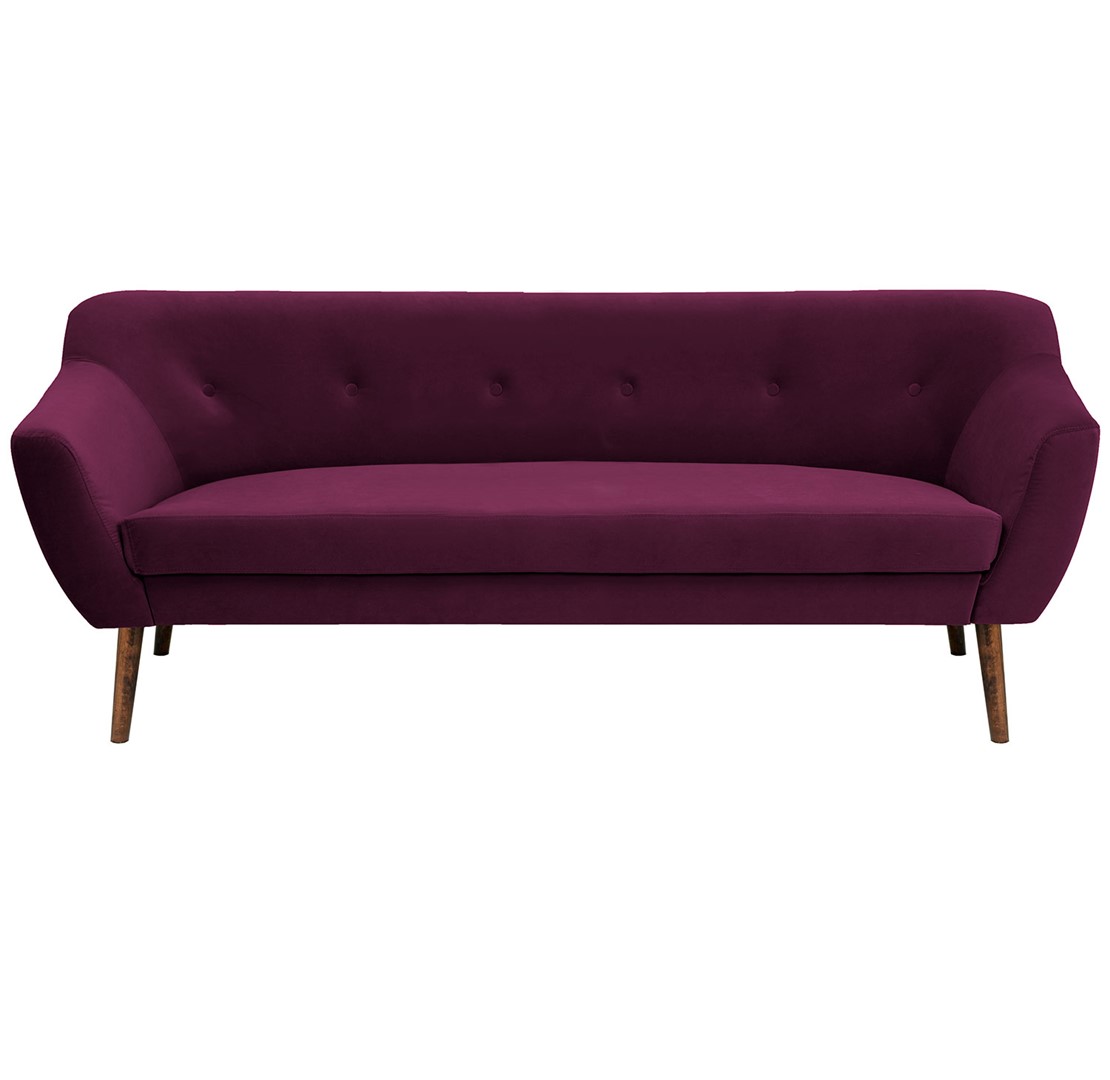 Tapicerowana sofa 3-osobowa Bergamo to nowoczesny mebel utrzymany w ciekawej stylistyce wpasuje się w każde wnętrze. Bukowe cienkie nogi oraz niskie oparcie dodają lekkiego skandynawskiego sznytu. Elementem dekoracyjnym są delikatne guziki na oparciu